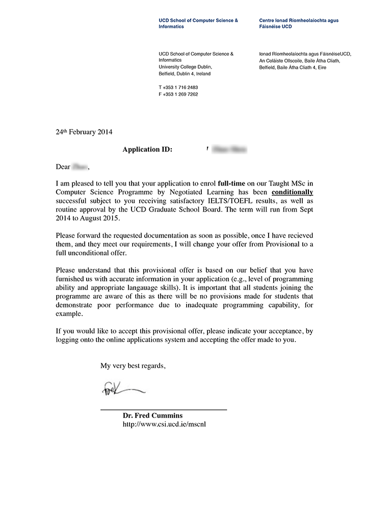 日前,一位来自辽宁大学广告学专业的本科毕业生(专升本)顺利获得了爱尔兰利莫瑞克大学(University of Limerick, UL)的市场营销、消费与社会硕士(MSc in Marketing, Consumption and Society)课程的条件录取通知书,录取条件为雅思总分达到6.5,单科不低于6.0,该课程将于2014年9月开学。
