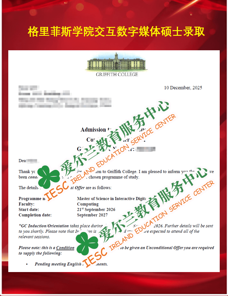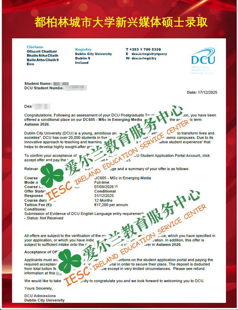 来自福建理工大学数字媒体艺术专业的本科毕业生,顺利获得了爱尔兰都柏林大学(University College Dublin)传播与媒体硕士课程(MSc Communication and Media)的条件录取通知书,条件为语言成绩达标(雅思总分6.5, 各单项不低于6.0)。