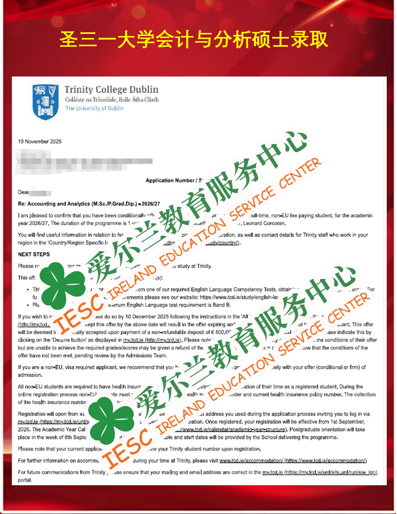 来自海南大学会展管理专业的本科同学,顺利获得了爱尔兰圣三一大学(Trinity College Dublin)会计与分析硕士课程 (MSc Accounting and Analytics)条件录取通知书,条件为本科毕业成绩达到二等一水平。