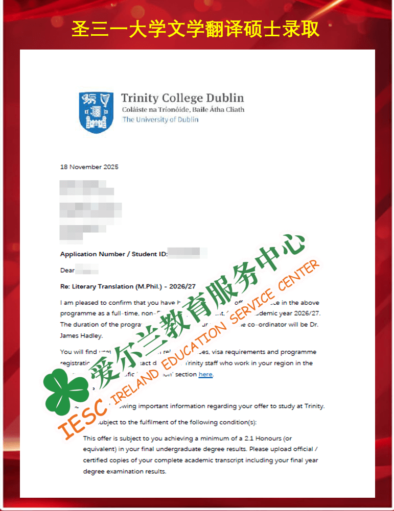 来自西交利物浦大学翻译与口译专业的本科同学,顺利获得了爱尔兰圣三一大学(Trinity College Dublin)文学翻译硕士课程(MPhil Literary Translation) 条件录取通知书,条件为本科毕业成绩达到二等一水平。