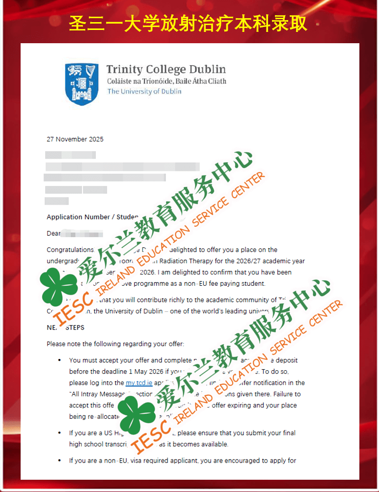 来自昆山康桥学校的美高体系高中同学,顺利获得了爱尔兰圣三一大学(Trinity College Dublin)放射治疗本科课程(BSc Radiation Therapy)条件录取通知书, 条件为提供高中最终成绩单。