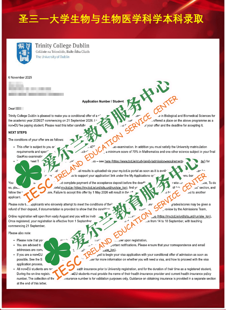 来自上海一国内普高体系同学,顺利获得了爱尔兰圣三一大学(Trinity College Dublin)生物与生物医学科学本科课程 (Biological and Biomedical Sciences)条件录取通知书, 条件是高考成绩达到475/660, 数学科目以及另一门理科科目成绩达到高考的70%。