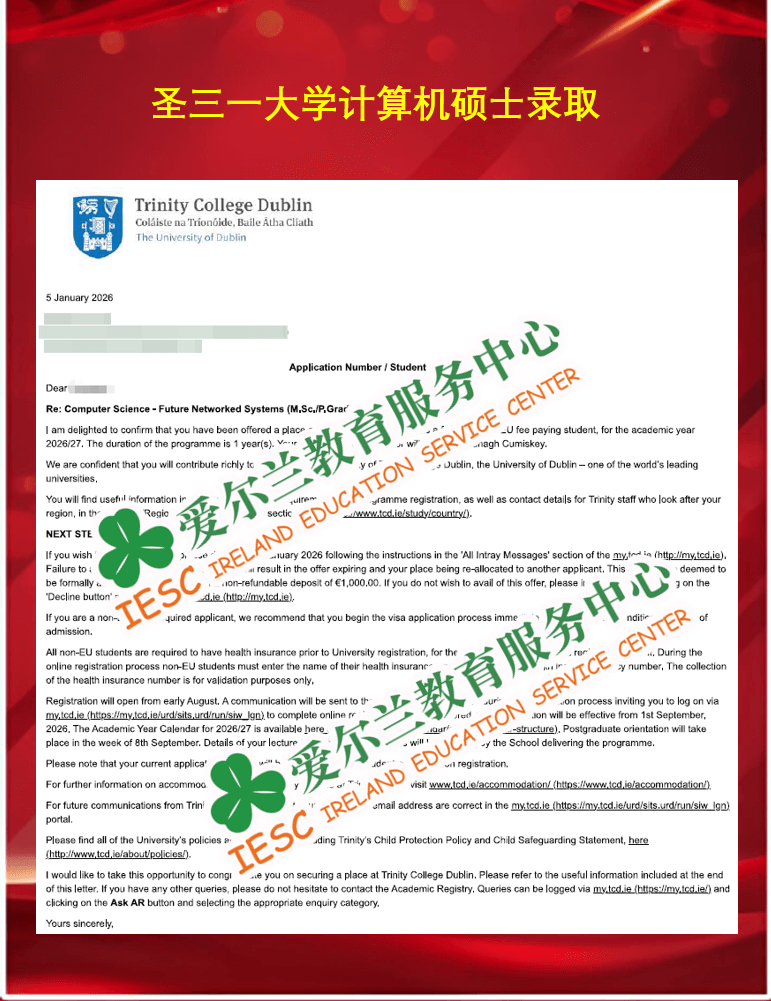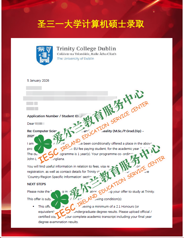 来自上海海洋大学计算机科学与技术专业的本科毕业生,顺利获得了爱尔兰圣三一大学(Trinity College Dublin)计算机科学-未来网络系统硕士课程(MSc Computer Science-Future Networked Systems)的无条件录取通知书。