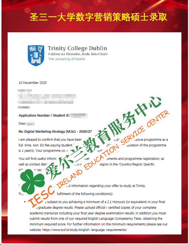 来自华东师范大学视觉传达设计专业的本科同学,顺利获得了爱尔兰圣三一大学(Trinity College Dublin)数字营销策略硕士课程 (MSc Digital Marketing Strategy)条件录取通知书,条件一为本科毕业成绩达到二等一水平,条件二为语言成绩达标(雅思总分7.0,单项6.5)。