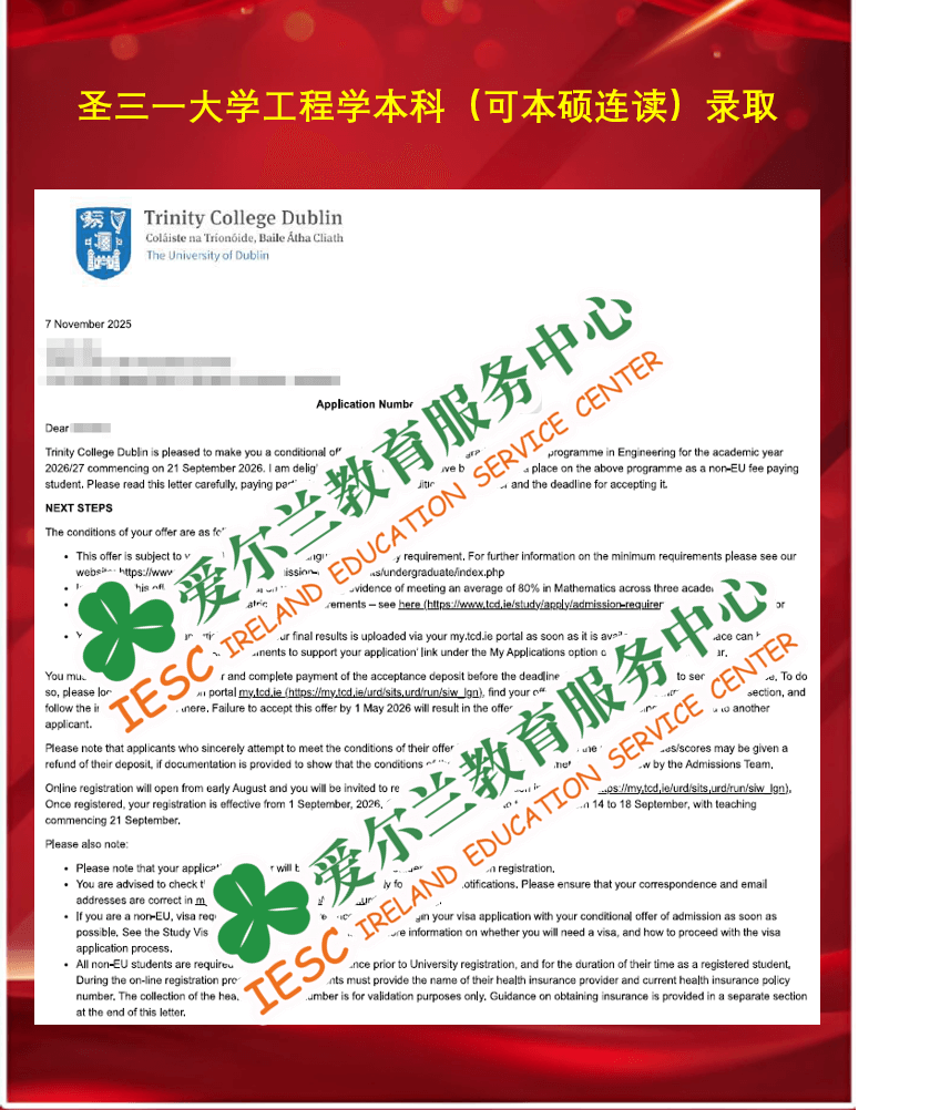 来自南通一国际高中同学,顺利获得了爱尔兰圣三一大学(Trinity College Dublin)工程本科课程 (Engineering)条件录取通知书, 条件是语言成绩达标(雅思总分6.5,单项6.0),以及高中三年数学平均分需达到80分。