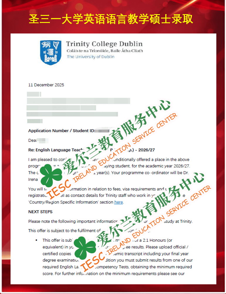 来自上海外国语大学商务英语专业的本科同学,顺利获得了爱尔兰圣三一大学(Trinity College Dublin)英语语言教学课程(M.Phil. English Language Teaching)的条件录取通知书, 条件一为本科毕业成绩达到二等一水平,条件二为语言成绩达标(雅思总分7.0,单项6.5)。