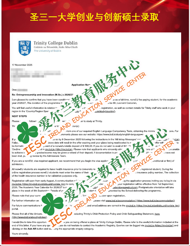 来自辽宁科技大学应用化学专业的本科同学,顺利获得了爱尔兰圣三一大学(Trinity College Dublin)创业与创新硕士课程 (MSc Entrepreneurship and Innovation)条件录取通知书, 条件是语言成绩达标(雅思总分6.5,单项6.0)。