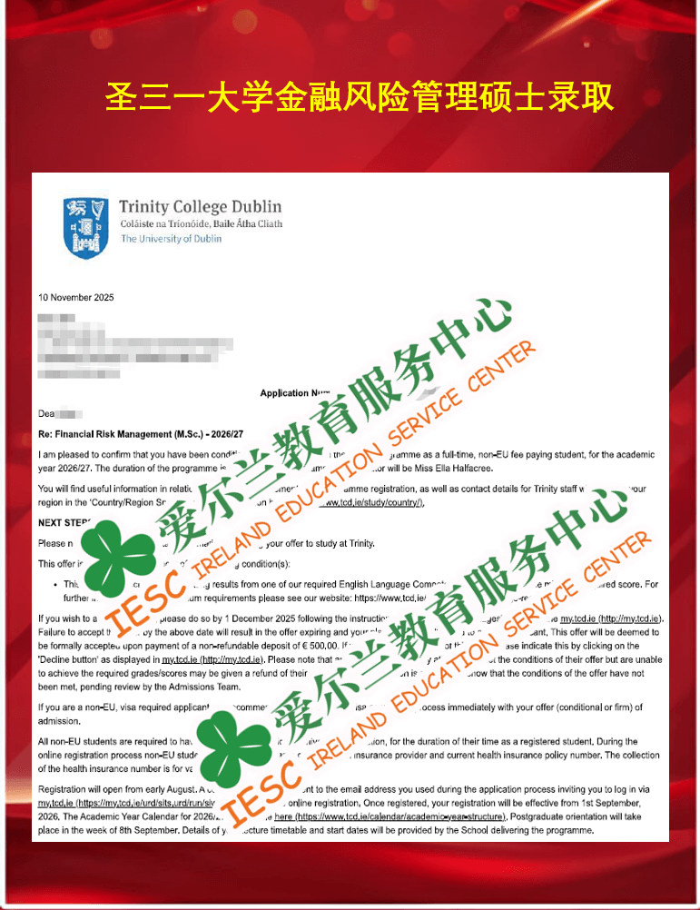 来自湖南农业大学会计学专业的本科同学,顺利获得了爱尔兰圣三一大学(Trinity College Dublin)金融风险管理硕士课程 (MSc Financial Risk Management)条件录取通知书, 条件是语言成绩达标(雅思总分6.5,单项6.0)。