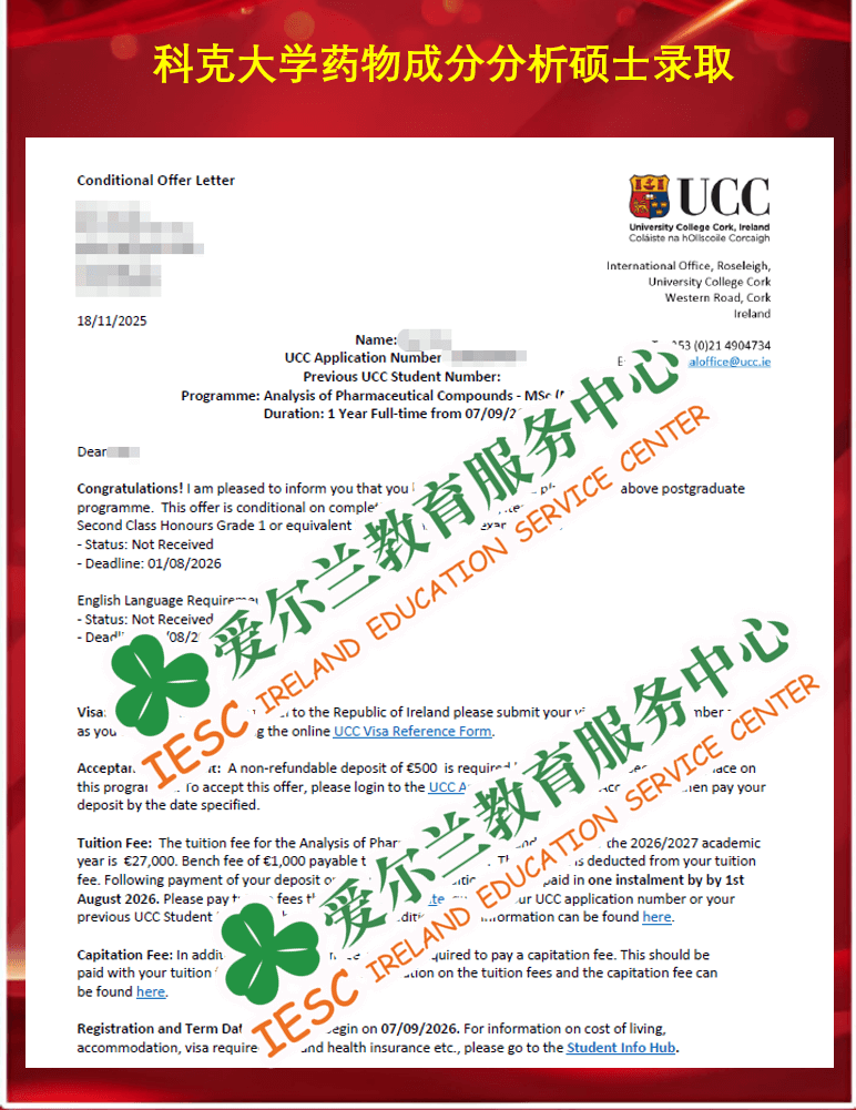 来自苏州科技大学应用化学专业的本科同学,顺利获得了爱尔兰科克大学(University College Cork)药物成分分析硕士课程 (MSc Analysis of Pharmaceutical Compounds)条件录取通知书, 条件一为语言成绩达标(雅思总分6.5,单项6.0); 条件二为本科最终成绩达到2等1同等水平。