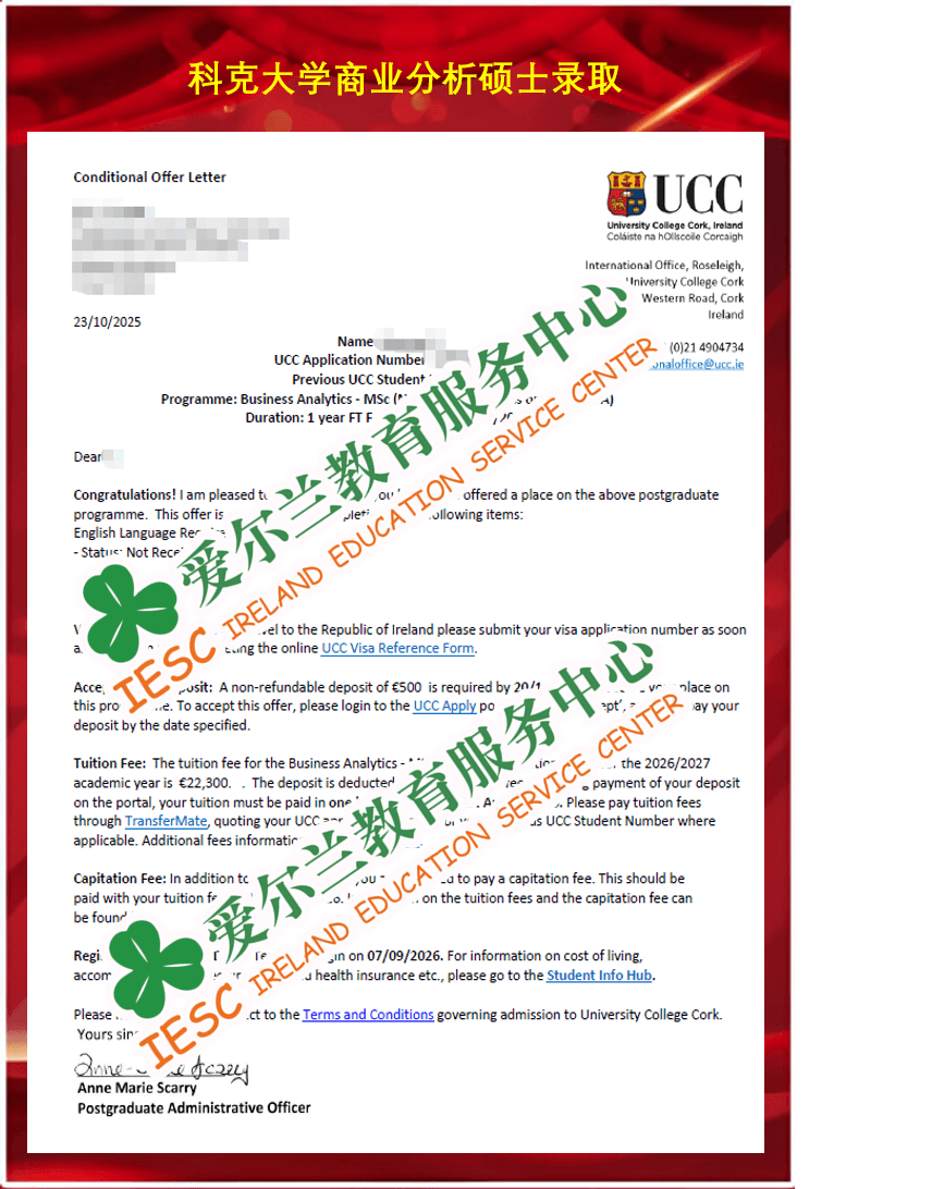 来自太原理工大学服装与服饰设计专业的本科毕业生,顺利获得了爱尔兰科克大学(University College Cork)企业绩效信息系统课程 (MSc Information Systems for Business Performance)条件录取通知书, 条件为语言成绩达标(雅思总分6.5,单项6.0)。