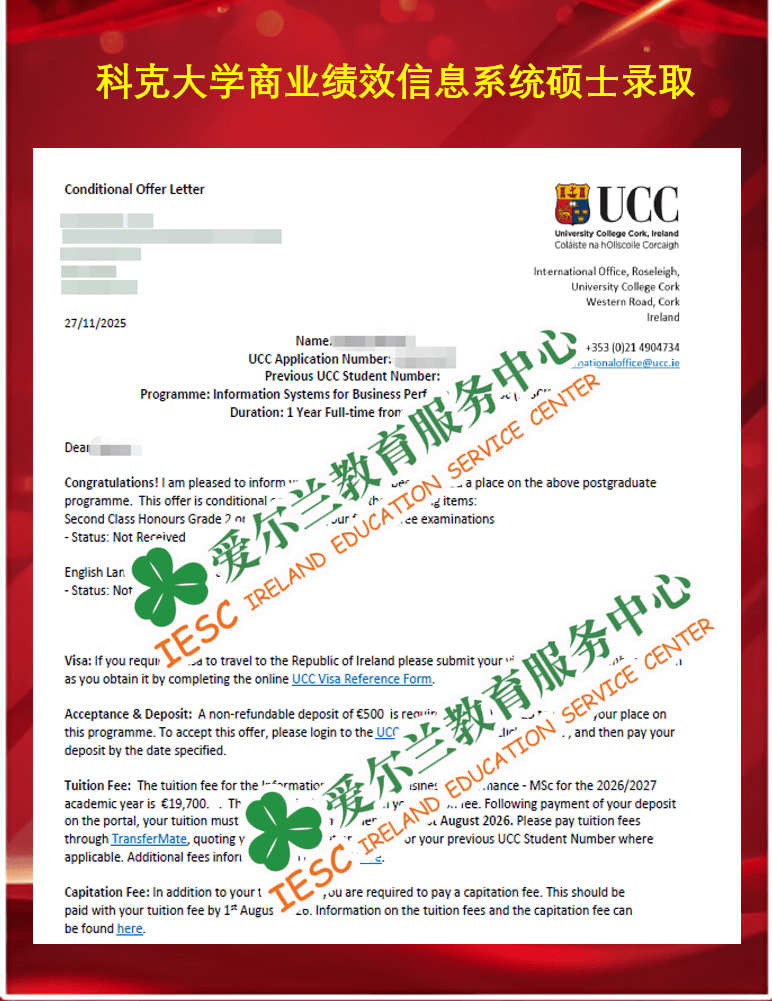 来自马来西亚理科大学英语专业的本科同学,顺利获得了爱尔兰科克大学(University College Cork)企业绩效信息系统课程 (MSc Information Systems for Business Performance)条件录取通知书, 条件一为语言成绩达标(雅思总分6.5,单项6.0); 条件二为本科最终成绩达到2等2同等水平。
