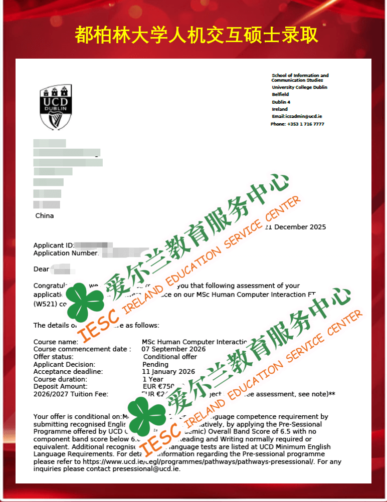 来自西交利物浦大学数据科学与大数据技术专业的本科同学,顺利获得了爱尔兰都柏林大学(University College Dublin)人机交互硕士课程(MSc Human Computer Interaction)的条件录取通知书,条件一为本科毕业成绩达到二等一水平,条件二为语言成绩达标(雅思总分6.5,单项6.0)