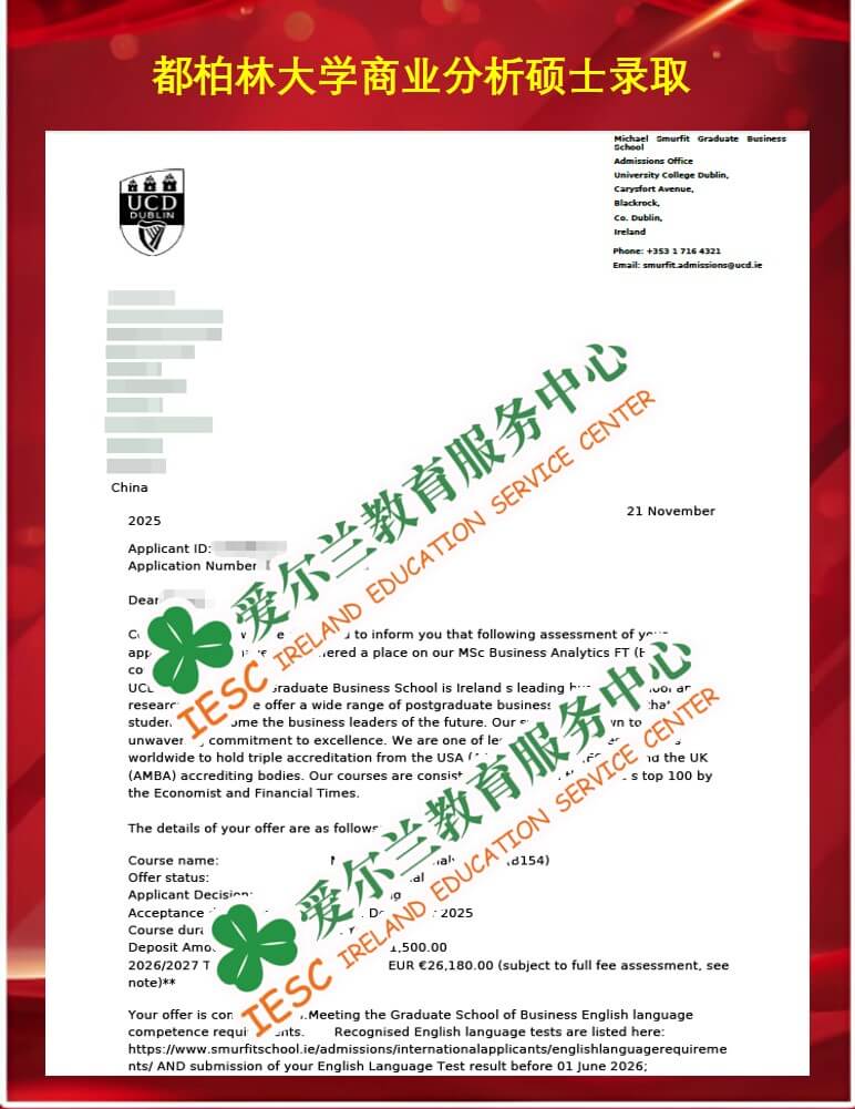 来自广东财经大学国际经济与贸易专业的本科毕业生,顺利获得了爱尔兰都柏林大学(University College Dublin)会计与财务管理硕士课程(MSc Accounting & Financial Management)的无条件录取通知书。