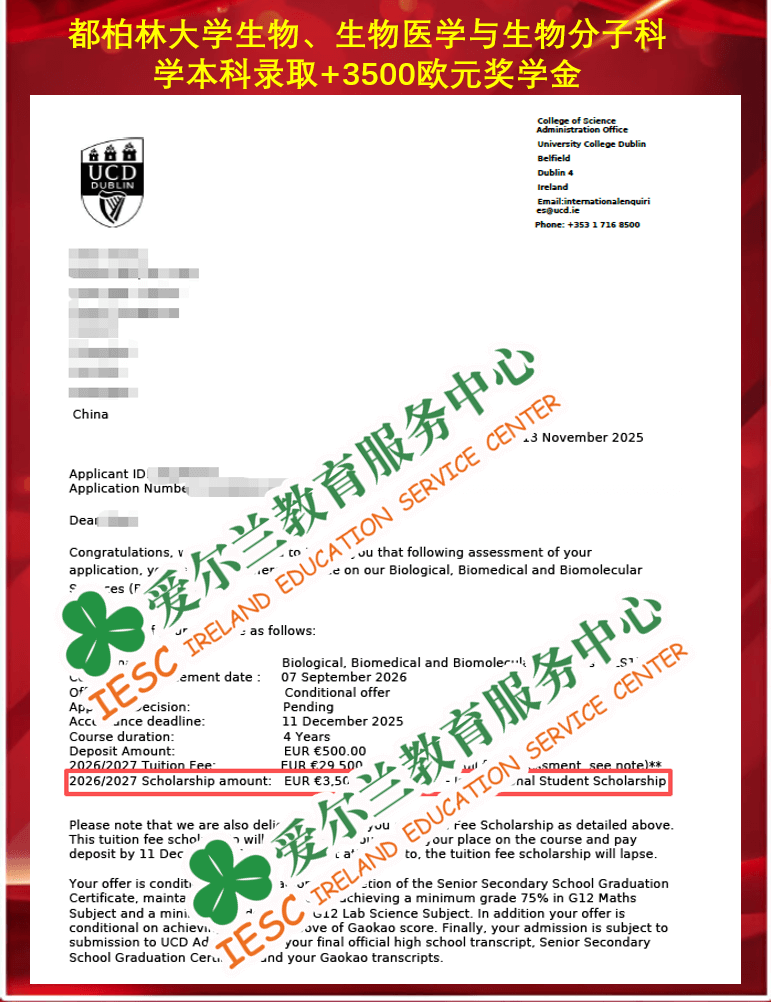 来自上海一国内普高体系同学,顺利获得了爱尔兰都柏林大学(University College Dublin)生物、生物医学与生物分子科学本科课程( Biological, Biomedical and Biomolecular Sciences)的条件录取通知书,条件是高考总分达到72%, 高三数学和另一门理科科目成绩均达到75%。