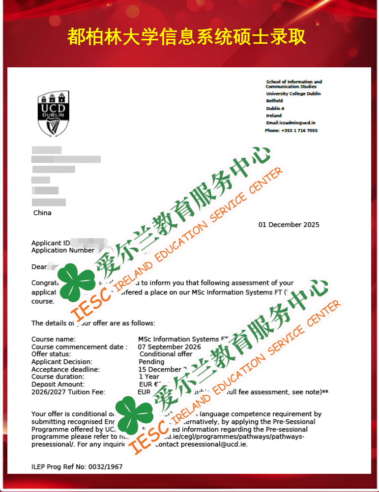 来自太原理工大学服装与服饰设计专业的本科毕业生,顺利获得了爱尔兰都柏林大学(University College Dublin)信息系统硕士课程(MSc Information Systems)的条件录取通知书,条件是语言成绩达标(雅思总分6.5,单项6.0)。