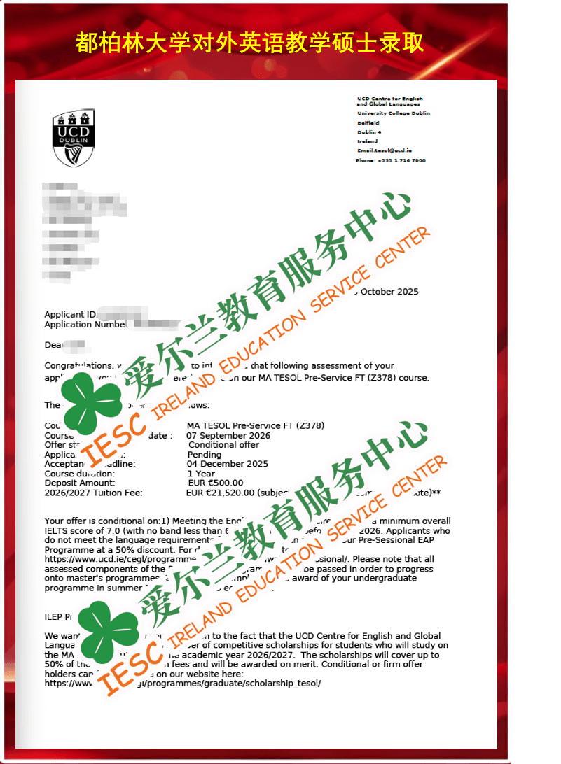 来自上海外国语大学商务英语专业的本科同学,顺利获得了爱尔兰都柏林大学(University College Dublin)英语语言教学-职前硕士课程(MA TESOL Pre-Service)的条件录取通知书, 条件1是语言成绩达标(雅思总分7.0,单项6.5),条件2是顺利完成本科学习。