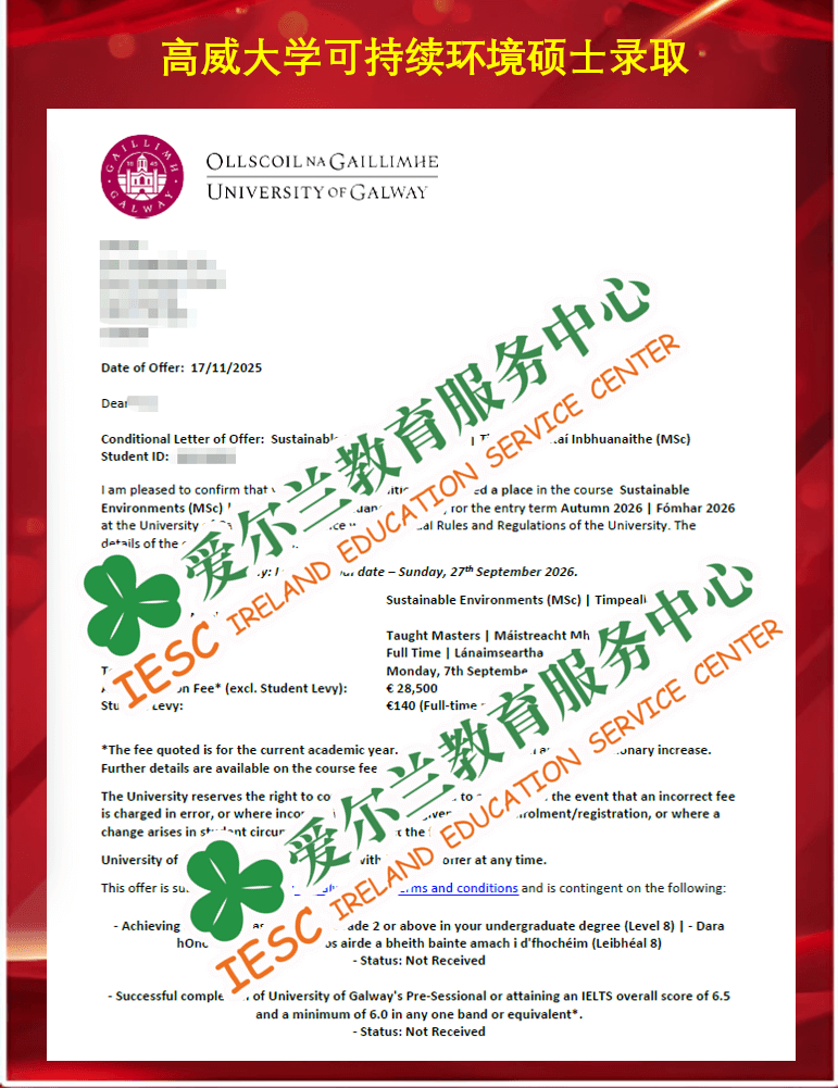 来自苏州科技大学应用化学专业的本科同学,顺利获得了爱尔兰高威大学(University of Galway)可持续环境硕士课程(MSc Sustainable Environments)条件录取通知书,条件1为雅思达到总分6.5, 其他单项不少于6.0分; 条件2为本科最终成绩达到2等2同等水平。