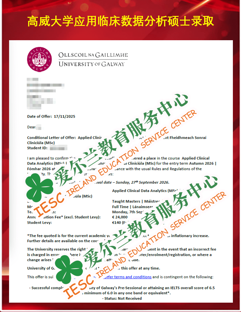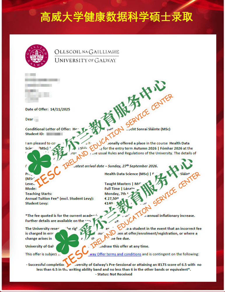 来自宁波大学科学技术学院临床医学专业的本科同学,顺利获得了爱尔兰高威大学(University of Galway)健康数据科学硕士课程(MSc Health Data Science)条件录取通知书,条件为雅思达到总分6.5, 写作单项6.5, 其他单项不少于6.0分。