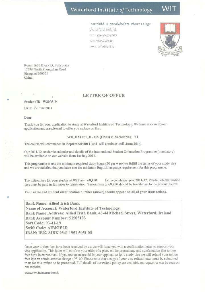 日前一名来自上海师范大学剑桥国际中心的在读学生成功获得爱尔兰沃特福德理工学院(Waterford Institute of Technology, WIT)的本科会计专业(Accounting)无条件录取通知书,并将于2011年9月份开学。